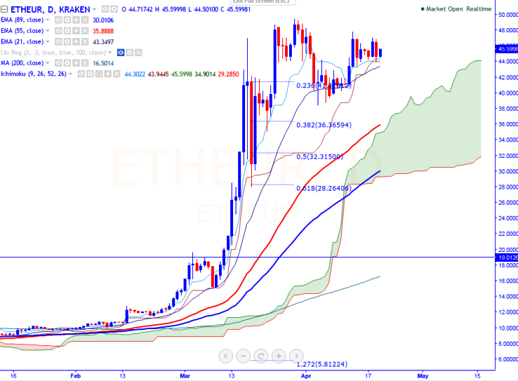 ETH/EUR pair is trading slightly above on Thursday and the pair has recovered slightly after declining till 44 yesterday (KRAKEN). It is currently trading around 45.53 at press time.