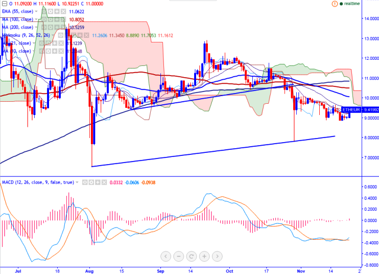ETH/EUR is seen trading well above on Tuesday. The pair has recovered sharply and trades slightly above 10- day MA (KRAKEN). It is currently trading around 9.419 at press time.