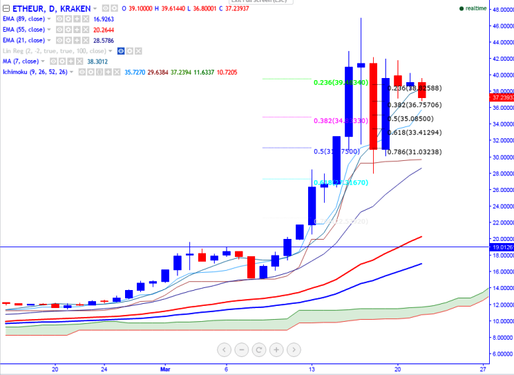ETH/EUR is see trading well above on Wednesday and the pair has declined once again after jumping till 41.79 (KRAKEN). It is currently trading around 37.20 at the time of writing.