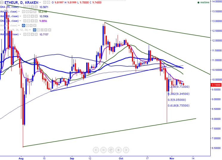 Long-term trend remains to be bearish. ETH/EUR upside is capped by 9- day EMA and any close above confirms minor bullishness.