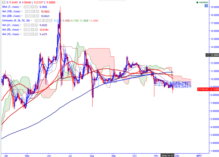 ETH/EUR is seen trading in red on Friday. The pair recovered sharply from the low of 8.21 made yesterday (KRAKEN). It is currently trading around 8.72 at the time of writing.