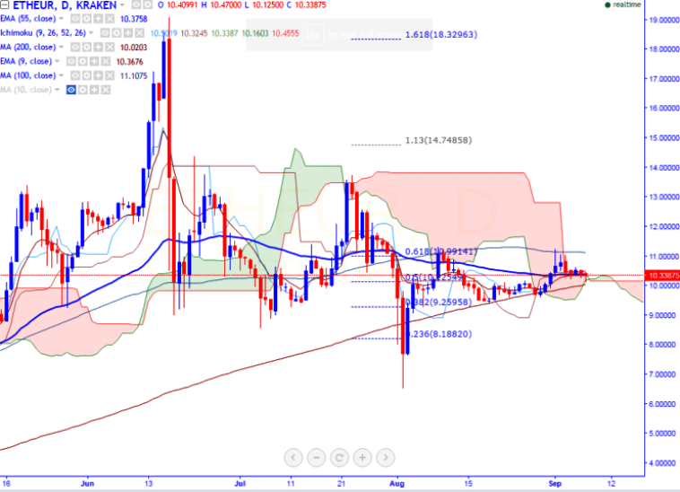 ETH/EUR is seen trading well below in red on Wednesday. The pair is trading flat between 10.12 and 10.62 for the past three trading session (KRAKEN). It is currently trading around 10.29 at the time of writing.