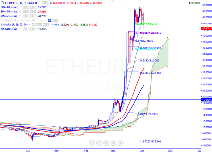 ETH/EUR pair has formed a temporary top around 49.48 and started to decline from that level (KRAKEN). ETH/EUR declined till 40.50 at the time of writing and slightly recovered from that level. It is currently trading around 42.29 at press time.