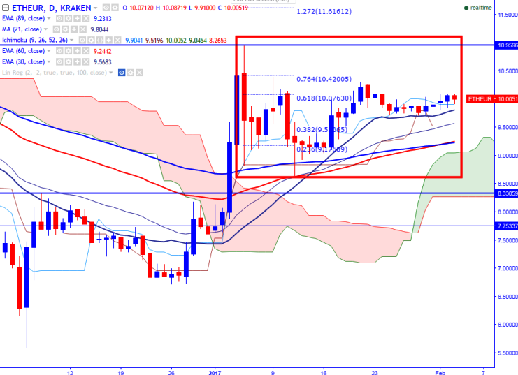 ETH/EUR is seen trading below in red on Friday. The pair has once again shown a mild decline after jump till 10.08 yesterday (KRAKEN). It is currently trading at 10.00 at the time of writing.