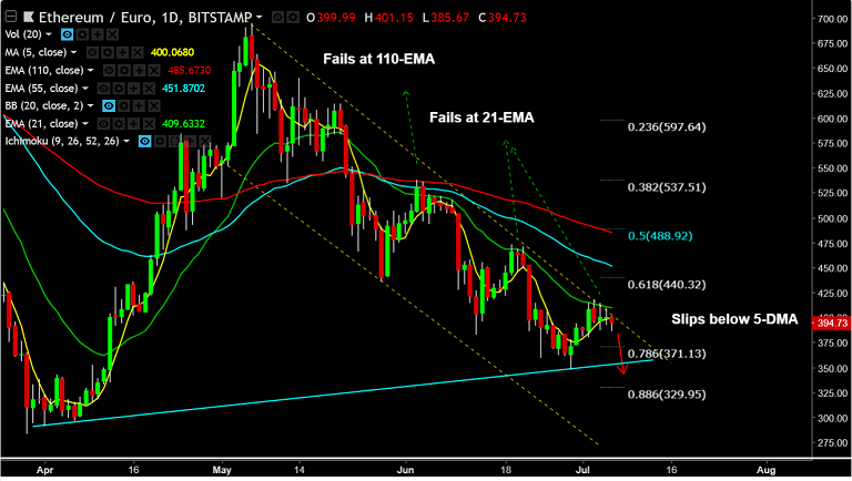 - ETH/EUR upside rejected at 21-EMA, pair extends lower after failure to break out of slopping channel.