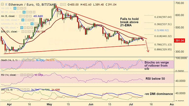 - ETH/EUR upside rejected at 21-EMA, the pair fails to hold break above.