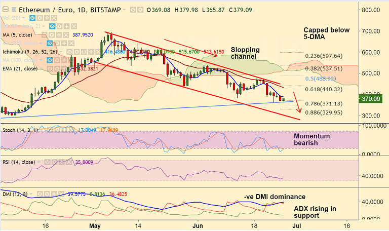- ETH/EUR trades 2.55% higher on the day at 379.08, but upside likely lacks traction.