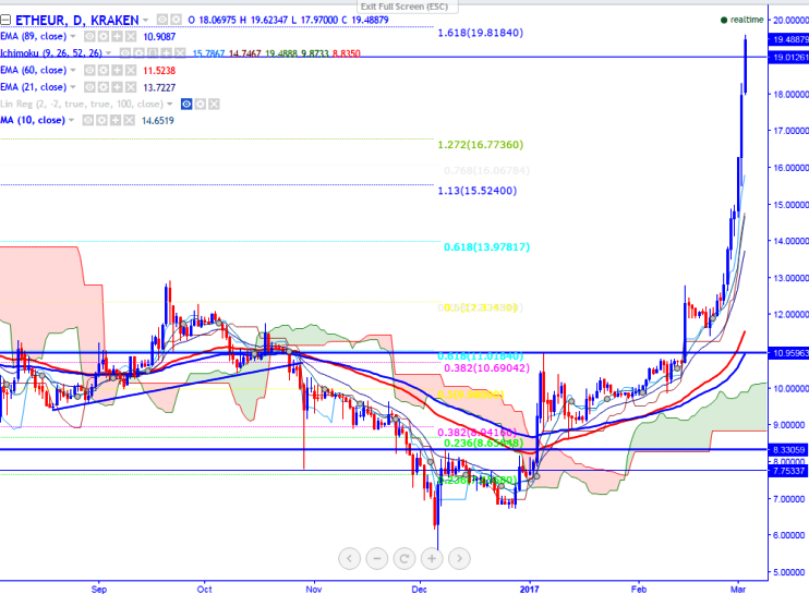 ETH/EUR is seen soaring high continually and is seen hitting a fresh all-time high on Friday. The pair has broken the high at 19.08 and hits fresh all-time high at the time of writing. Short term trend is extremely bullish as long as support 14.08 (daily Kijun-Sen) holds (KRAKEN). It is currently trading around 19.50 at the time of writing.