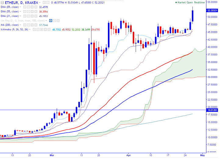 ETH/EUR pair broken the high of 49.48 and spiked till 53.51 at the time of writing as Ethereum bids for Wall Street ETF application. It is currently trading around 52.82 at the time of writing (KRAKEN).