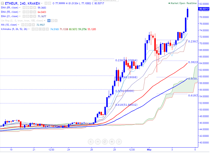Long-term trend remains to be bullish. ETH/EUR hits fresh all time high and further jump till 90.91/100 likely.