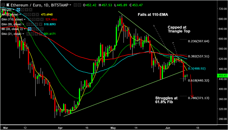 - The pair is struggling to close below 61.8% Fib. Next major support below 61.8% Fib at 440 lies at 436 (May 28 lows) ahead of 371 (78.6% Fib).
