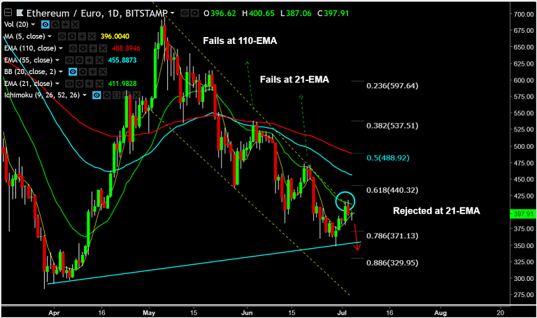 - ETH/EUR upside rejected at 21-EMA, pair slips below 400 handle to close Tuesday's trade at 396 levels.