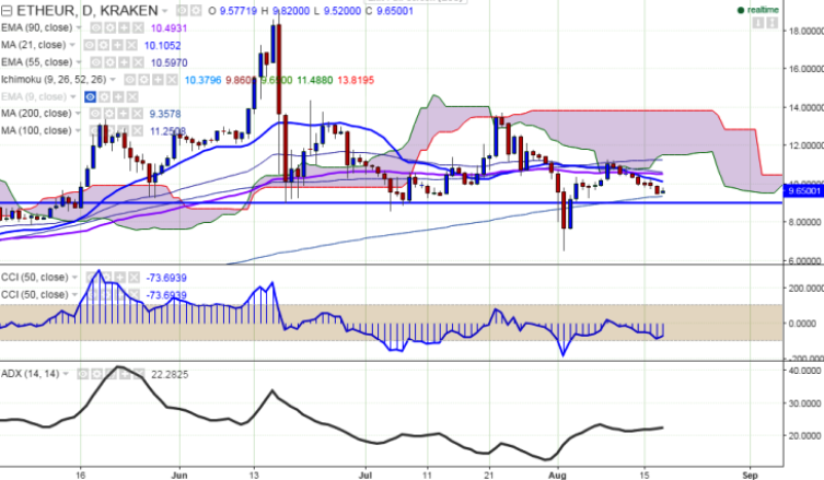 ETH/EUR is seen trading slightly above on Thursday after the plunge. The pair has slightly recovered after making a low of 9.510 but not able close above psychological 10 level (KRAKEN). It is currently trading at 9.70 at the time of writing.