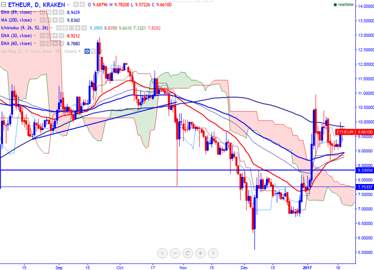 ETH/EUR is seen trading slightly below in red on Thursday. The pair is trading in a narrow range between 9.99 and 8.64 for the past seven trading sessions (KRAKEN). ETH/EUR jumped till 9.99 yesterday and is currently trading at 9.65 at the time of writing.
