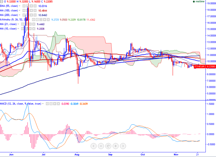 ETH/EUR is seen trading below in red on Wednesday. The pair has retreated slightly after climbing till 9.64 levels (KRAKEN). It is currently trading around 9.24 at press time.