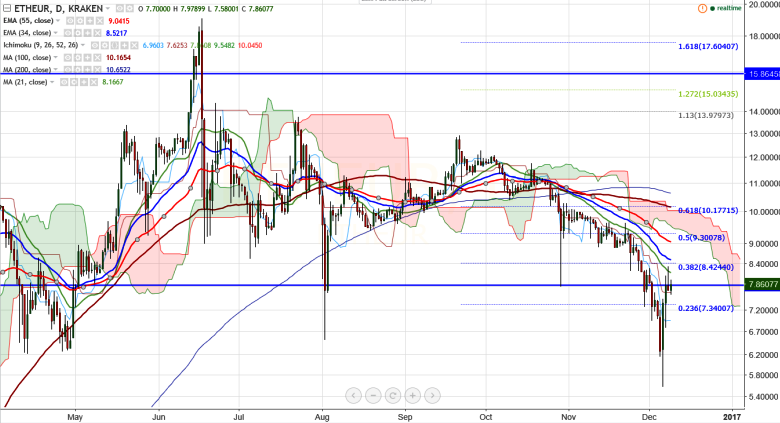 ETH/EUR is seen trading slightly below on Friday. The pair made a high of 8.33 yesterday and shown a selling pressure from that level (KRAKEN). It is currently trading around 7.76 at the time of writing.