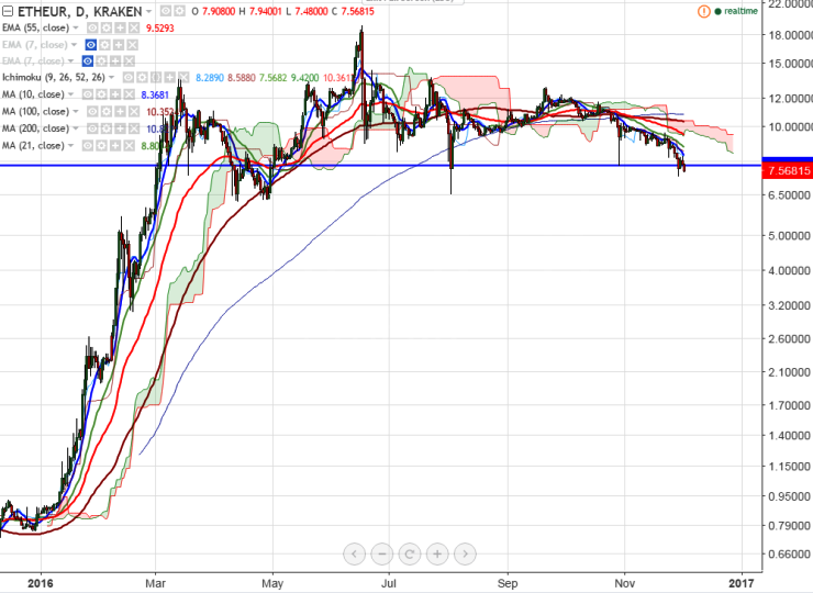 ETH/EUR is seen trading below in red on Friday. The pair declined slightly after jumping till 8.29 yesterday (KRAKEN). It is currently trading around 7.55 at the time of writing.