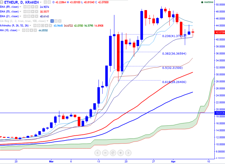 ETH/EUR is trading above on Thursday as the pair has recovered sharply till 44.25 yesterday after declining to 38.40 levels (KRAKEN). It is currently trading around 42.50 at the time of writing.