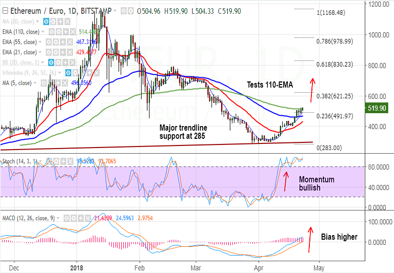 - ETH/EUR tests 110-EMA at 514 levels, decisive break above could see further upside.