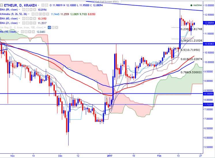 ETH/EUR is seen trading slightly above on Thursday. The pair has formed a temporary top around 12.79 on Feb 14th 2017 high. ETH/EUR slightly declined till 11.41 from the high. It is currently trading around 12.14 at the time of writing.