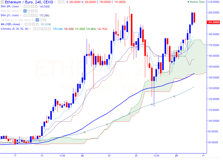 ETH/EUR pair has formed a minor bottom around 113 and jumped sharply near all-time high from that level (KRAKEN). The pair jumped till 200 at the time of writing and it is currently trading around 192 at the time of writing.
