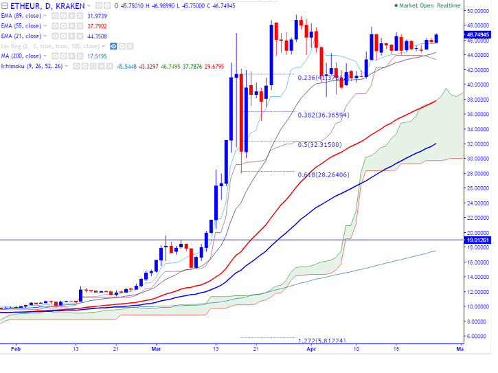 ETH/EUR pair formed a temporary top around 49.48 on Mar 29th 2017 high and is consolidating almost a month from that level (KRAKEN). It is currently trading around 47.69 at press time.