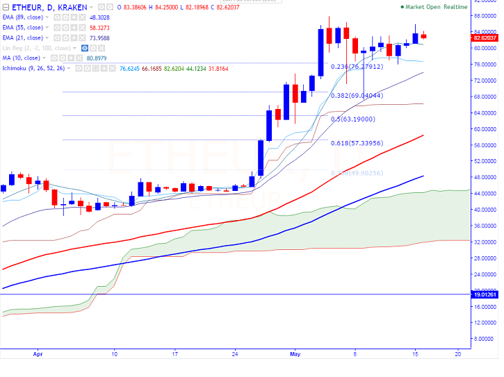 ETH/EUR pair is consolidating in narrow range between 85.99 and 76 for the past three days (KRAKEN). It is currently trading around 82.61 at press time.