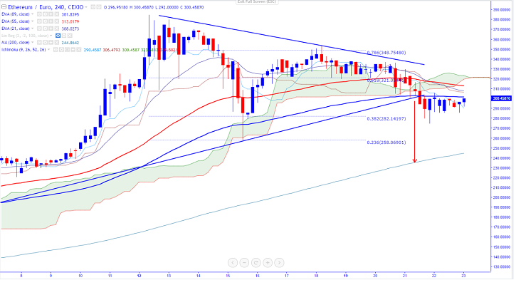 ETH/EUR pair recovered slightly after hitting a low of 275 levels (KRAKEN). Minor term trend is weak as long as resistance 354 holds. It is currently trading around 287 at press time.