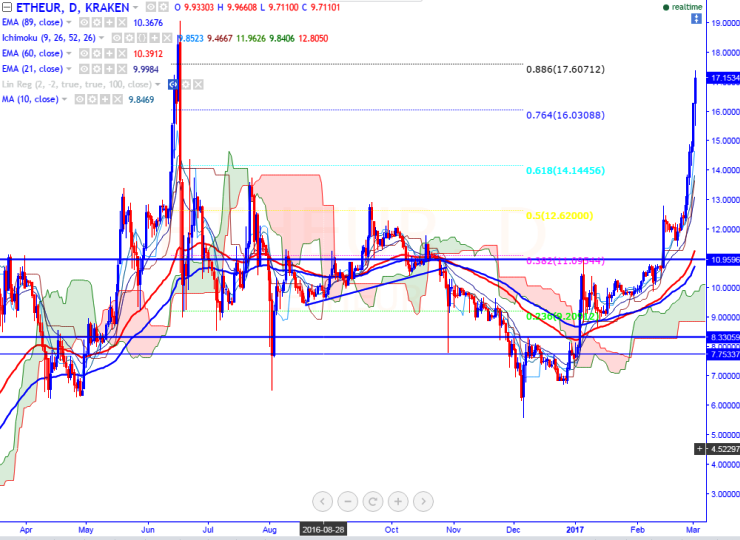 ETH/EUR is seen soaring high continually post the recent formation of Ehereum Enterprise Alliance. The pair has broken major resistance around 16.03 (76.4% retracement of 19.08 and 6.79) and jumped till 17.40 at the time of writing (KRAKEN). Short term trend is bullish as long as support 12.66 (21-day EMA) holds. It is currently trading around 17.20 at the time of writing.