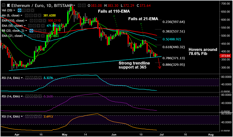- ETH/EUR trades in narrow range, with the day's high at 383 and low at 372 levels.