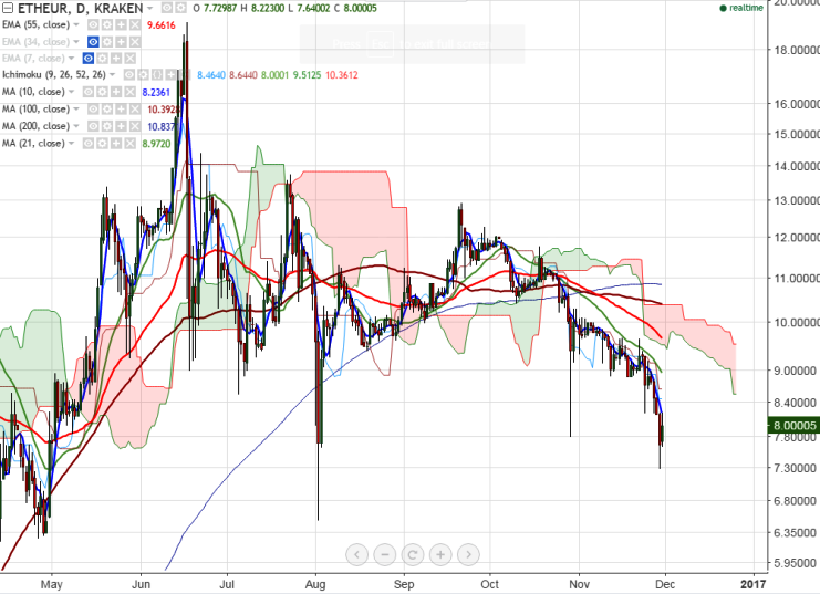 ETH/EUR is seen trading slightly above on Wednesday after showing a plunge. The pair slightly jumped till 8.22 after making a low of 7.28 yesterday (KRAKEN). It is currently trading around 7.94 at the time of writing.