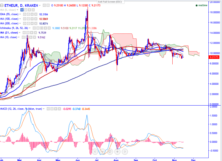 Long-term trend remains to be bearish. ETH/EUR upside is capped by 10 day MA and any close above confirms minor bullishness till 10.30 is possible.