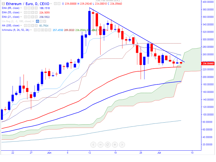 ETH/EUR pair has declined after hitting high of 249 levels (KRAKEN). ETH/EUR formed a temporary top around 385 and further bullish continuation only above that level. It is currently trading around 235 at the time of writing.