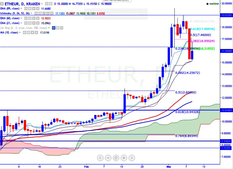 ETH/EUR pair has taken support near 21- day EMA and jumped slightly from that level. ETH/EUR is facing strong support at 15 (21- day EMA and daily Kijun –Sen) and any break below confirms further weakness (KRAKEN). It is currently trading around 15.95 at the time of writing.