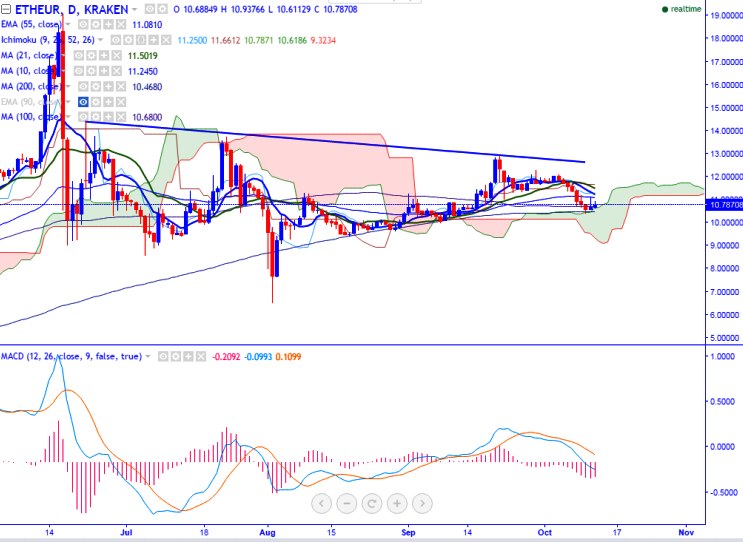 ETH/EUR is seen trading slightly above on Wednesday after the plunge. The pair has retreated sharply after making a high of 11.09 levels (KRAKEN). It is currently trading around 10.8 at the time of writing.