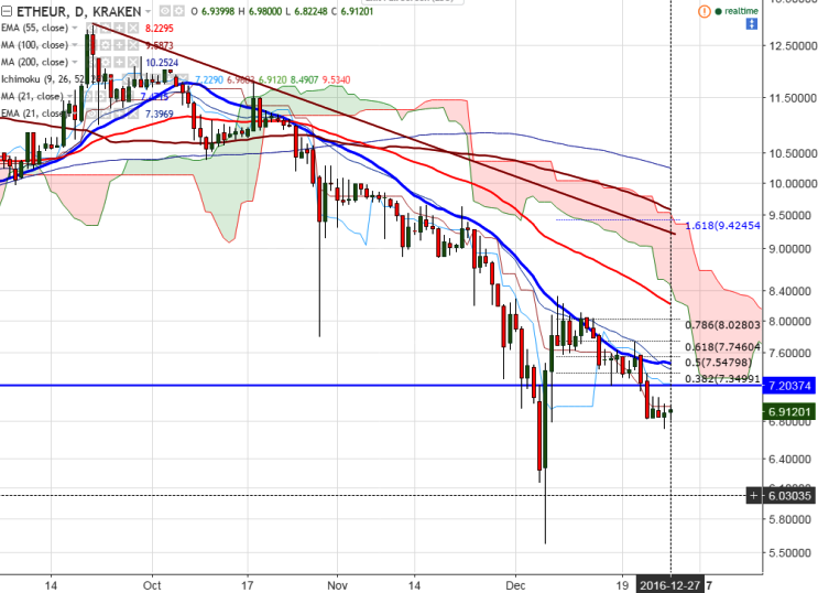 ETH/EUR is seen fluctuating on Tuesday. The pair has broken major support 7.20 and declined till 6.72 levels (KRAKEN). It is currently trading around 6.94 at the time of writing.