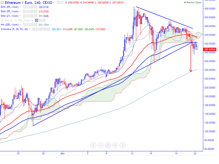 ETH/EUR pair declined sharply breaking major support at 300 levels (KRAKEN). ETH/EUR declined till 275 and is currently trading around 287 at the time of writing.