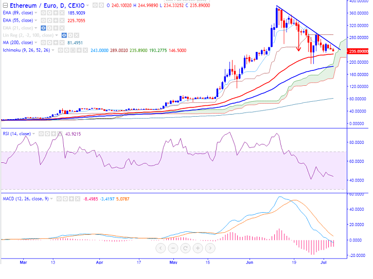 ETH/EUR pair has minor jump above daily Kijun-Sen and declined sharply from that level (KRAKEN). ETH/EUR formed a temporary top around 385 and further bullish continuation only above that level. It is currently trading around 235 at press time.