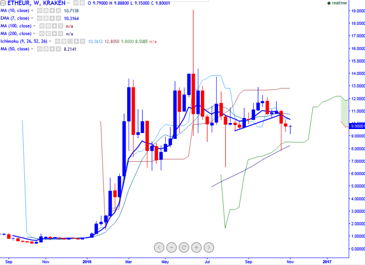 ETH/EUR is seen trading low on weekly trend as seen on Friday. The pair has taken support around 50-WMA on Oct last week and recovering from that level for the past two weeks (KRAKEN). It is currently trading around 9.54 at the time of writing.