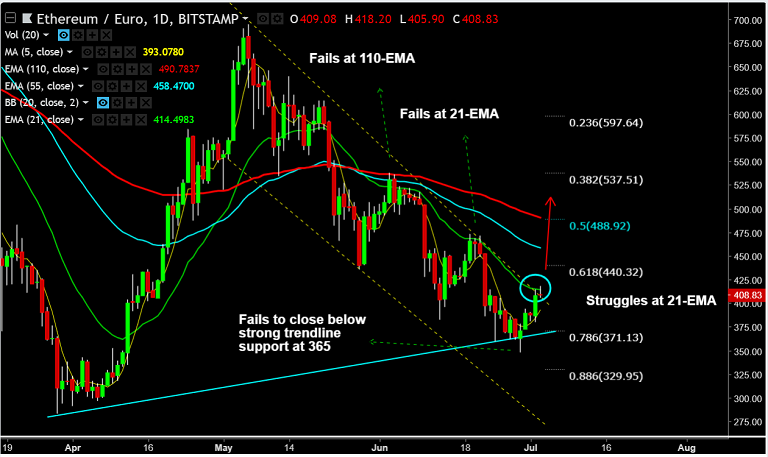 - ETH/EUR upside momentum fades at 21-EMA, the pair retraces from session highs at 418 to trade at 408 levels.
