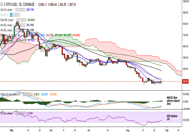 ETH/USD successfully closed above 10-DMA on Monday at 287 levels.