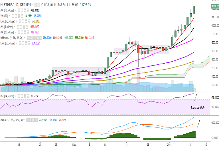 ETH/USD is trading higher on Tuesday and has broken above 1200 levels. It is currently trading at 1230 levels at the time of writing (Kraken).