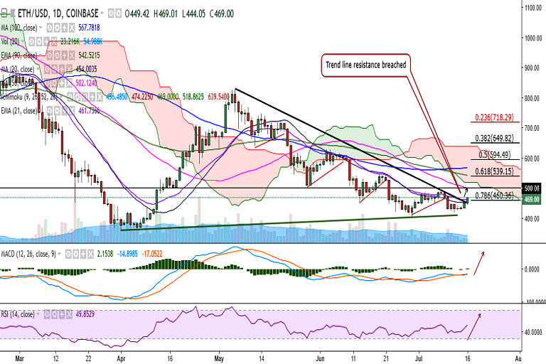ETH/USD is trading higher on Monday as it broke above trend line resistance joining 828.97 and 494.74. It is currently trading at 467 levels at the time of writing (Coinbase).
