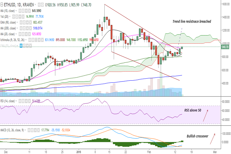 ETH/USD has broken above the trend line resistance and is trading at 944 levels at the time of writing (Kraken).