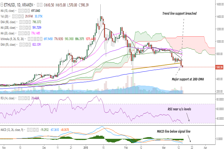 ETH/USD moved further south on Thursday as it broke below trend line support joining 556 and641. It is currently trading at 590 levels at the time of writing (Kraken).