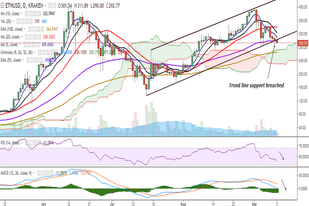 ETH/USD broke below the 300 mark and hit 285 levels on September 10, 2017. It is currently trading at 291 levels at the time of writing (Kraken).