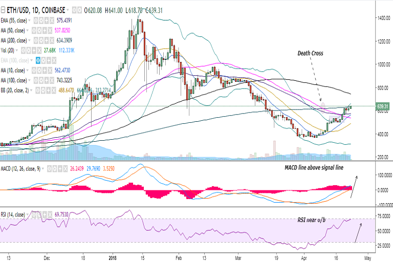 ETH/USD has entered Ichimoku cloud and currently trading just above 200-DMA at 640 levels at press time (Coinbase).