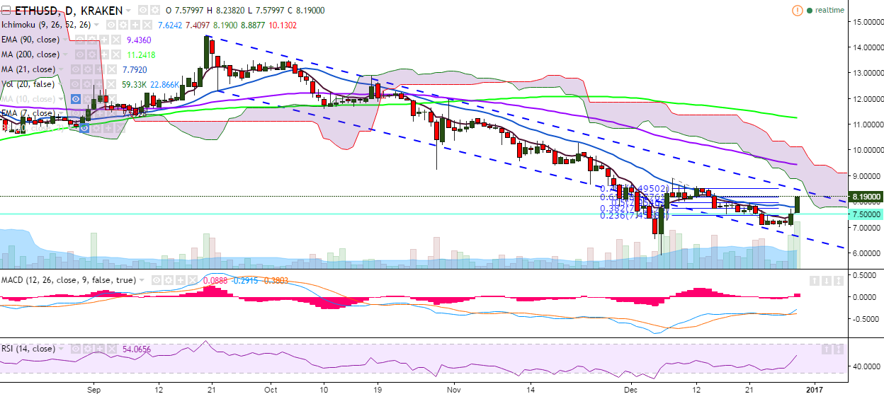 ETH/USD soared higher on Thursday on the back of newly found momentum and has broken 21-day MA. It is currently trading at 8.19 levels (Kraken).