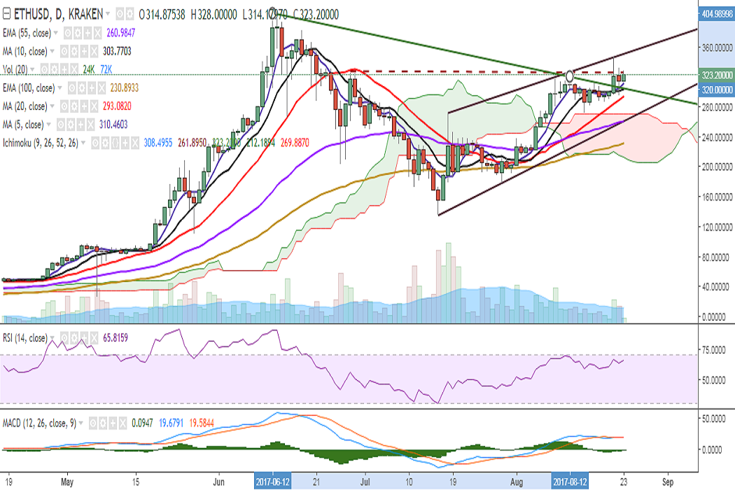 ETH/USD is trading in a close range as it continues to face strong resistance at 325 levels, where it currently trades (Kraken).