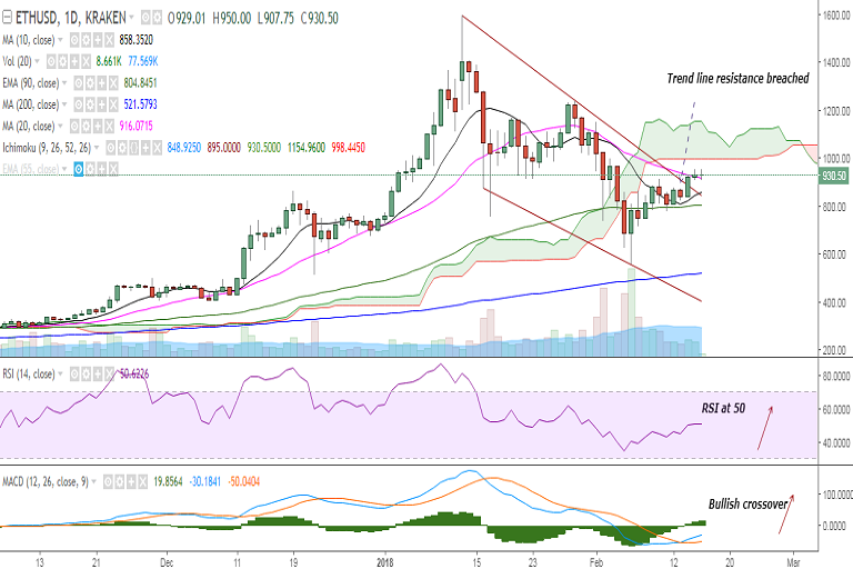 On the upside, the pair faces resistance at 985 (50-DMA) and a break above would then eye 998 levels (Cloud bottom)/ 1075 (50% retracement of 1594.89 and 556). Further strength would see it testing 1100/1154 (Cloud top).